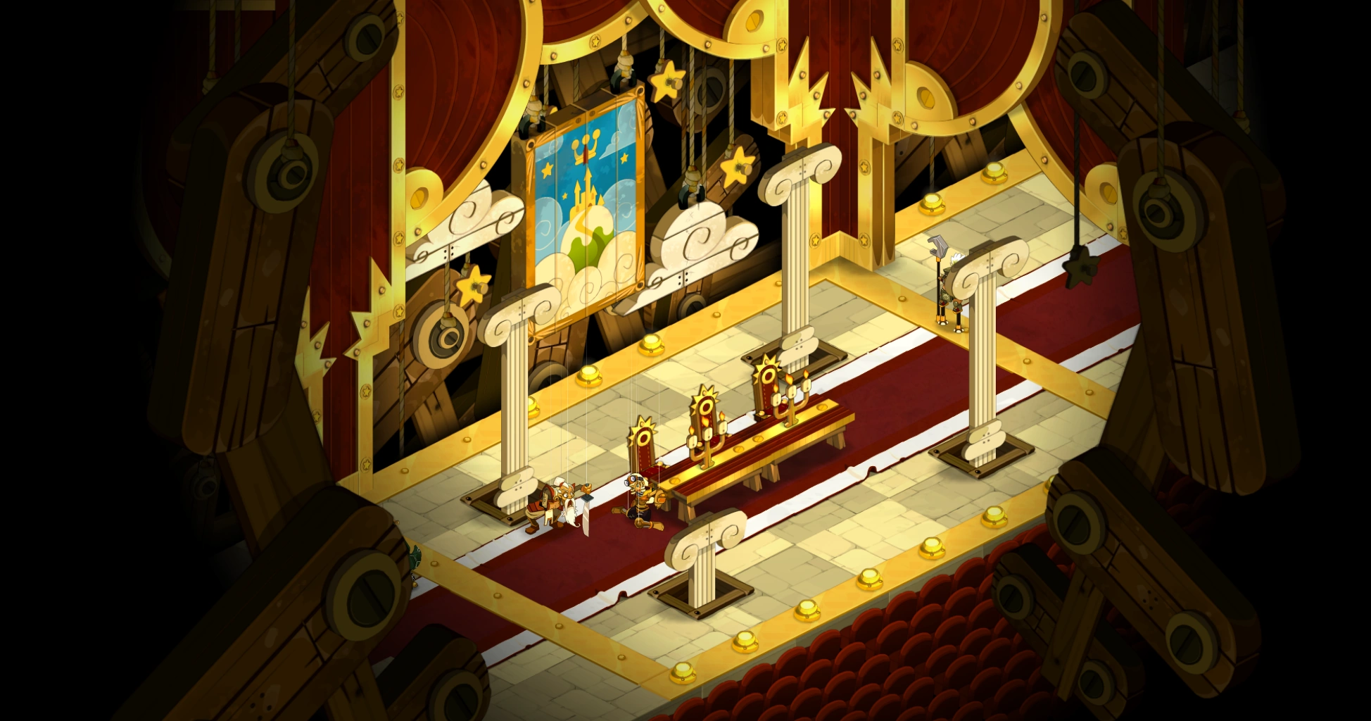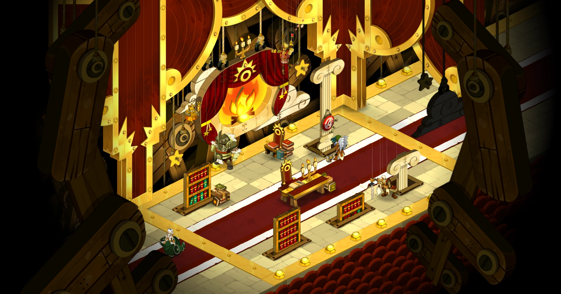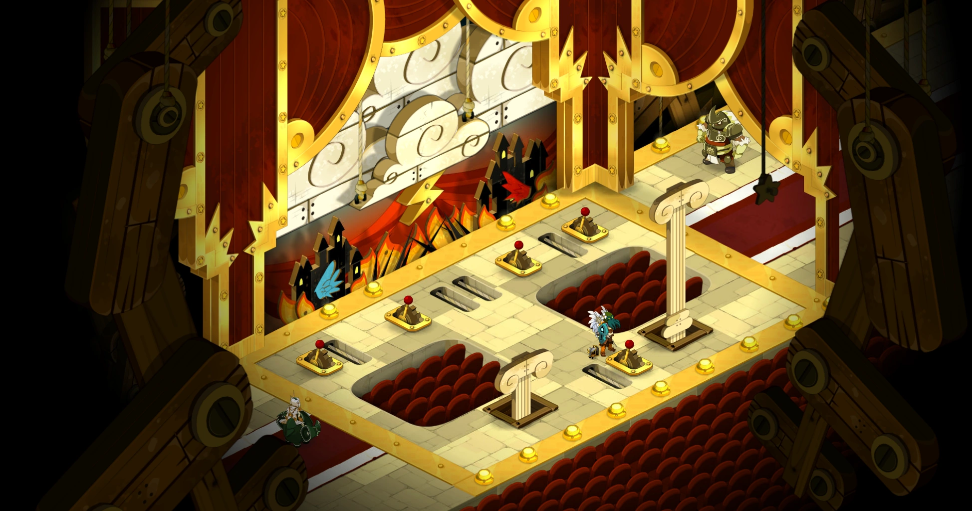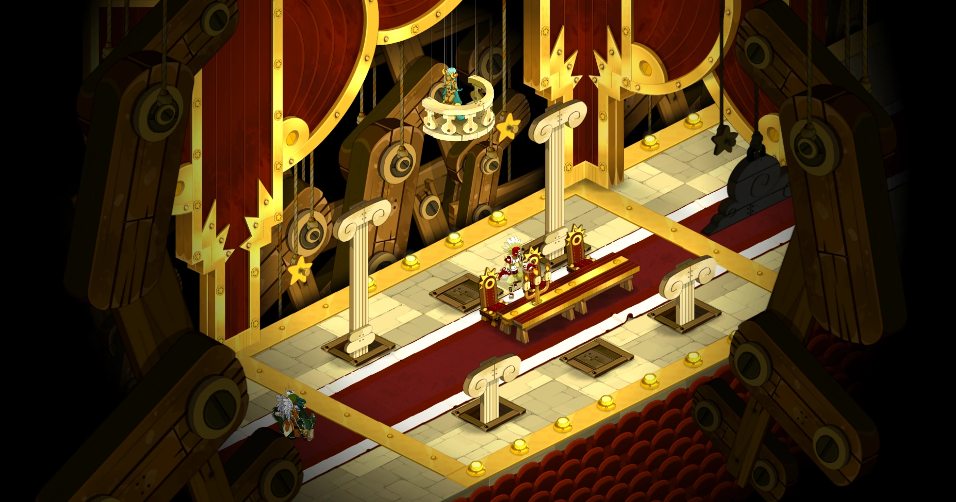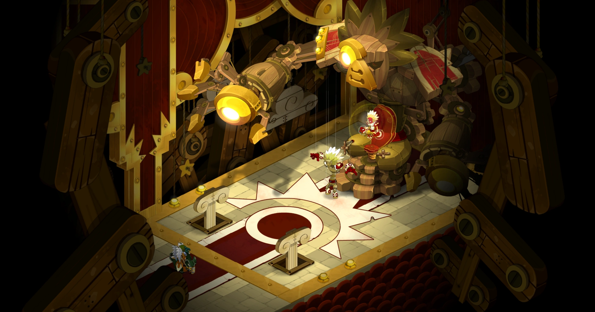 Der Dungeon besteht aus fünf Räumen. In den ersten drei befinden sich Gobzeter, Bulldoger, Schraubenverdreher und Rhinoferoxe. Im dritten Raum findet ihr ein Rätsel vor (Mit Hilfe von fünf Hebeln ist eine Bühnendekoration so einzustellen, dass nichts "Böses" mehr sichtbar ist. Also kein Feuer, keine Blitze etc.) Wenn alles korrekt justiert wurde, öffnet sich ein Wurmloch, durch das ihr schlüpft und im zweiten Raum dorthinter den NSC ansprecht. Er lehrt euch das Emote "Jonglieren".