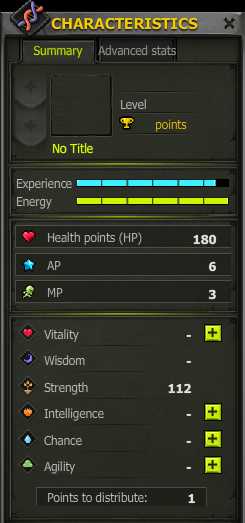Characteristics, often referred to as statistics or stats, are what defines your character's potential. Characteristics are normally boosted by level, equipment or Characteristic Scrolls. Some Characteristics can be altered by resetting them.