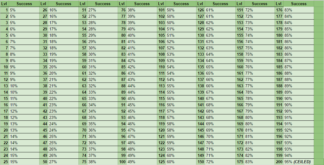The base success rate for level 200 is: